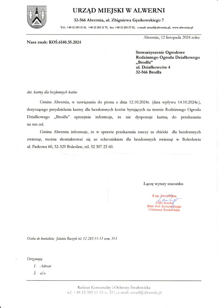 Pismo w sprawie karmy dla kotów