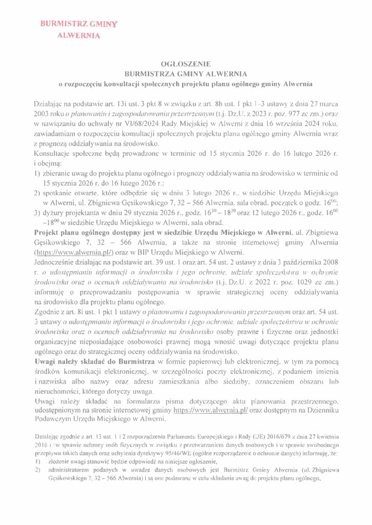 Ogłoszenie Burmistrza Gminy Alwernia o rozpoczęciu konsultacji społecznych projektu planu ogólnego gminy Alwernia. Można zgłaszać uwagi do planu. Zarząd ROD “Brodła” Plan Ogólny Zagospodarowania Przestrzennego – konsultacje